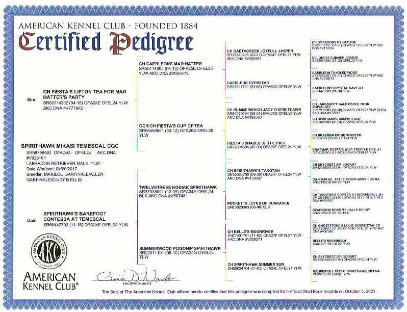 Sire: Ch Fiesta’s Lipton Tea For Mad Hatter’s Party/ Dam: Spirithawk’s Barefoot Contessa  At Temescal
