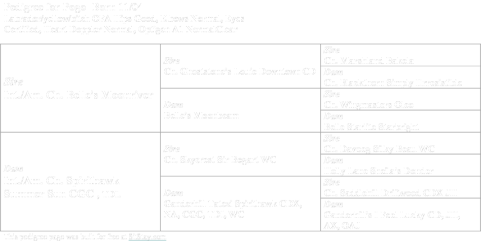 Wind Morgan hips and elbows normal, OFA hips Fair, Elbows Normal, Optigen PRA Clear, Heart Echoed Clear, eyes checked clear annually and EIC clear.