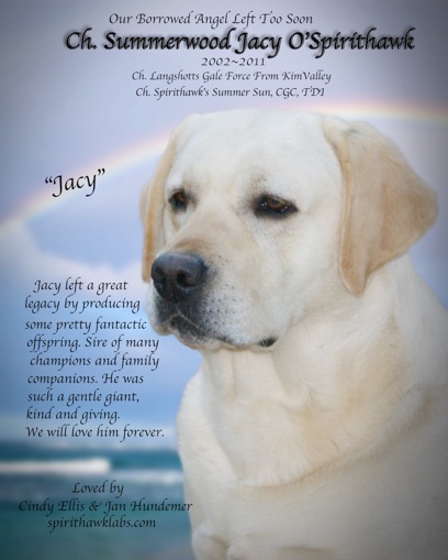 We lost our Summer in August of 2011. She gave her owner, Janice Hundemer and family, 13 years of love and devotion and is greatly missed. She now runs with her son, Jacy, waiting patiently at the Gate.